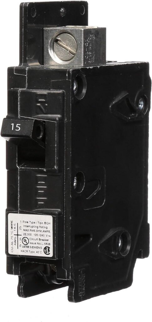 Siemens BQ series single pole 15 ampere bolt-on molded case circuit breaker with maximum voltage rating of 240V at 60Hz tripping method thermal magnetic and hig interrupting rating of 22 kiloampere at 120V complete with non-interchangeable trip (LI) long-time and instantaneous trip functions and load side lug terminals.