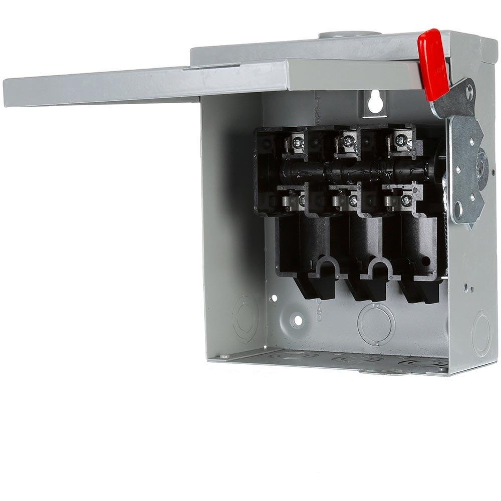 • Product Description: Siemens Low Voltage Circuit Protection General Duty Safety Switch. 2-Pole or 3-Pole Non-Fused in a type 3R enclosure (outdoor). Rated 240VAC (30A). Horse power: 1-PH 2-W (3), 3-PH 3-W (7-1/2), 250VDC (5). Special features: service entrance labeled suitable for 3-PH motor loads