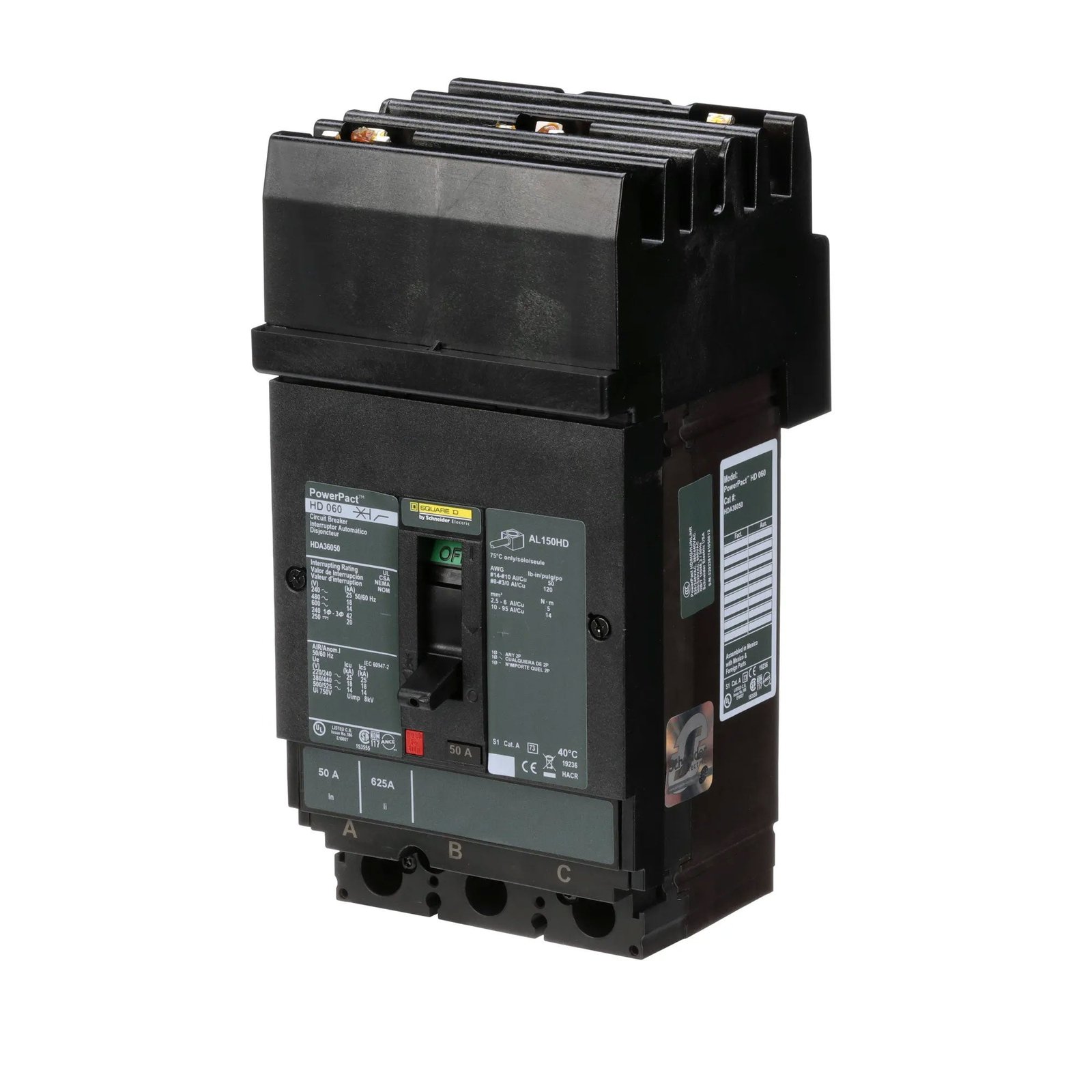 Square D, Powerpact, type HDA, 3PH, 3P, ABC phase connection, 50A, 600V, 18kA@480V, standard interrupting capacity, i-line style plug-in, UL listed, suitable for reverse fed applications, complete with non-interchangeable trip, LI – Long-Time and Instantaneous trip functions, thermal magnetic, molded case circuit breakers.