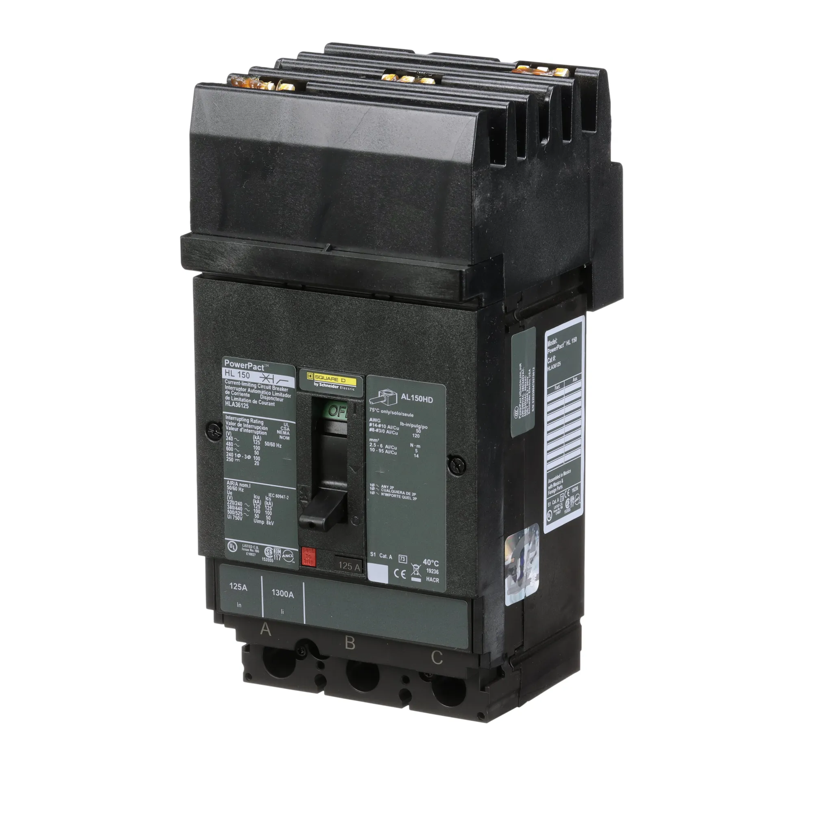 Square D, Powerpact, type HLA, 3PH, 3P, ABC phase connection, 125A, 600V, 100kA@480V, current limiting, i-line style plug-in, UL listed, suitable for reverse fed applications, complete with non-interchangeable trip, LI – Long-Time and Instantaneous trip functions, thermal magnetic, molded case circuit breakers.