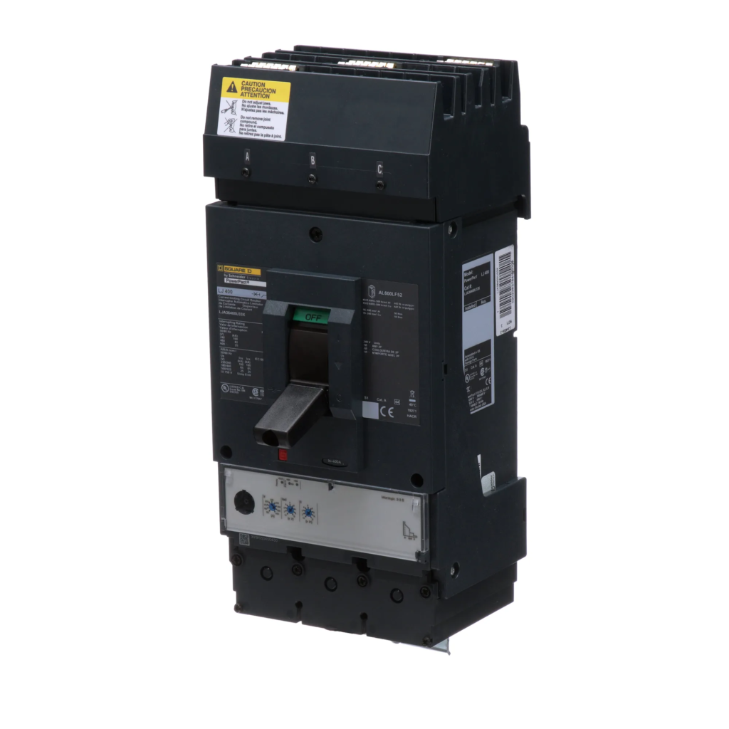 Schneider Electric / Square D, Powerpact, type LJA, 3P, 3PH, 400A, 600V, 65kA@480V, UL listed, standard interrupting capacity, i-line style plug-in, can used for 2P applications, complete with non-interchangeable micrologic standard 3.3 trip, LSI – Long-Time, Short-Time and Instantaneous trip functions, solid state electronic, molded case circuit breakers.