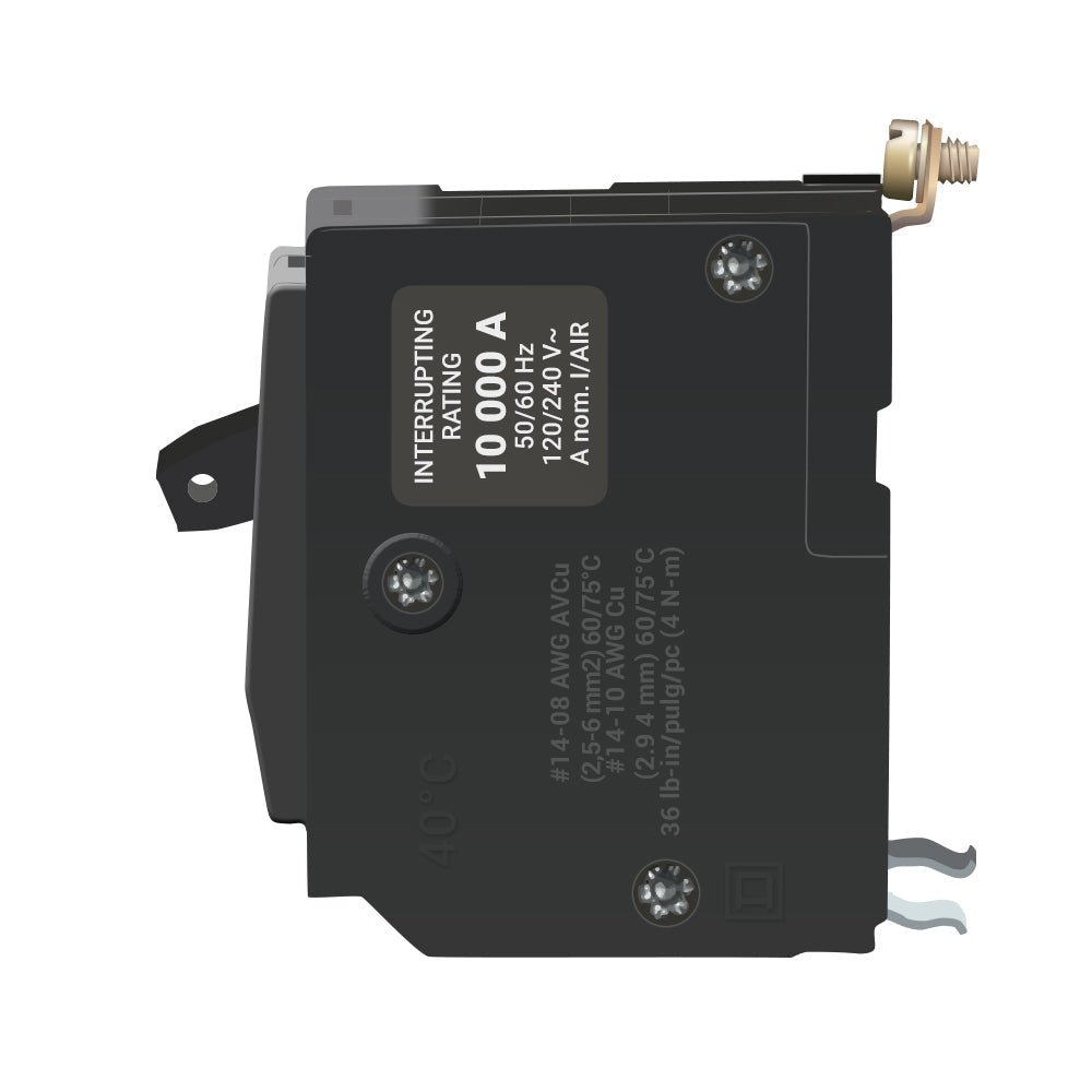 Square D bolt-on circuit breaker has a voltage rating of 120/240 Volts current rating of 15 Amps and interrupting rating of 10 kilo-Amps. The 1-Pole thermal magnetic circuit breaker features a lug terminal and accommodates aluminum/copper wire size of 14 – 8 AWG.